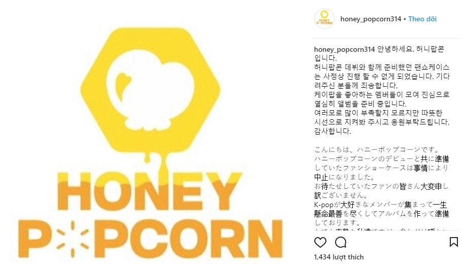 “Xin chào, đây là Honey Popcorn. Buổi showcase dành cho các fan dự định được tổ chức cùng với màn debut nhóm sẽ không diễn ra nữa vì một số lý do nhất định. Chúng tôi xin lỗi tất cả những ai đã mong chờ. Hiện tại, các thành viên, những người cực yêu thích Kpop vẫn đang cùng nhau chuẩn bị cật lực cho album sắp tới. Mặc dù có thể sẽ còn thiếu sót nhưng chúng tôi mong rằng mọi người sẽ đón nhận nồng nhiệt và cổ vũ cho nhóm. Cảm ơn rất nhiều”.