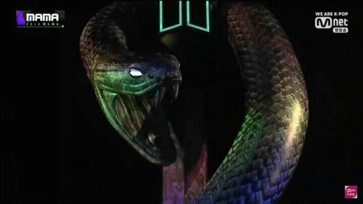 Ấn tượng nhất chắc chắn phải kể đến mô hình con rắn khổng lồ trên sân khấu trong tiết mục trình diễn của BTS. Mặc dù biết chỉ là một mô hình, thế nhưng độ chân thật của “bé Na” đã khiến không ít người cảm thấy rợn da gà vì hội chứng sợ bò sát. Nhiều khán giả còn đùa rằng, sau sân khấu vói con rắn to đùng này, một màn collab trong tương lai giữa Taylor Swift và BTS sẽ được diễn ra? Vì “rắn chúa”vốn là biệt danh của Taylor Swift và cô nàng cũng thường xuyên mang những mô hình “bé Na”khổng lồ lên sân khấu.