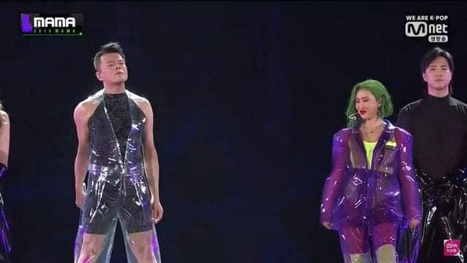 Một trong những sân khấu ấn tượng nhất MAMA 2019 chắc chắn phải kể đến màn kết hợp của chủ tịch Park Ji Young và Hwasa (MAMAMOO). Tuy nhiên, không thể không nhắc đến những bộ trang phục như áo mưa được chưng diện trong tiết mục đầy nóng bỏng này. Dù lâu lắm mới tái xuất, thế nhưng phong độ của chủ tịch Park vẫn không hề suy giảm, đã vậy còn kết hợp cùng cô nàng cá tính Hwasa càng làm cho sân khấu trở nên hấp dẫn hơn bao giờ hết.