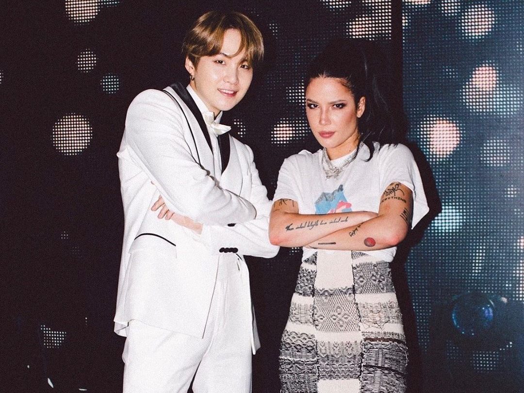 Màn kết hợp tiếp theo cũng gây ấn tượng không kém đó chính là với “quái vật nhạc số” Heize. Ca khúc We don’t talk together là một màn hợp tác của Suga cùng Heize với vai trò nhạc sĩ viết lời, sản xuất lẫn cả sáng tác. Tuy không góp giọng nhưng Suga cũng đã mang đến những giai điệu đầy cá tính, đậm chất riêng trong ca khúc We don’t talk together. Ngoài các nghệ sĩ nữ Kpop, Suga cũng đã từng hợp tác với ngôi sao nữ quốc tế chính là Halsey. Ca khúc SUGA’s Interlude được chính anh chàng viết lời, soạn nhạc và đặc biệt là còn góp giọng cùng Halsey trong bài này. Bài hát này đã nhanh chóng nhận được phản ứng tốt của khán giả quốc tế.