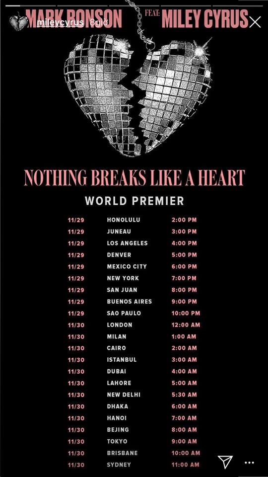 Sau một thời gian im ắng, cô nàng lắm chiêu của chúng ta - Miley Cyrus - cuối cùng cũng đã trở lại đường đua âm nhạc với một ca khúc ấn tượng kết hợp cùng Mark Ronson: Nothing Breaks Like A Heart. Trước khi ra mắt ca khúc, cái tên Việt Nam đã nằm “chễm chệ” trên story Instagram của Miley cùng với một số quốc gia khác với một lời nhắc cực đáng yêu về giờ lên sóng của sản phẩm âm nhạc này.