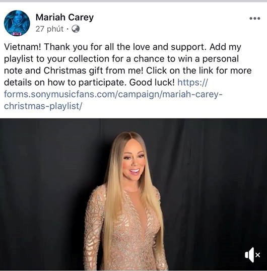 Vừa mới đây, nữ diva huyền thoại Mariah Carey đã khiến loạt fan Việt Nam “đứng ngồi không yên” khi cô đăng tải dòng tus “thả thính”: “Việt Nam! Cảm ơn vì tất cả tình yêu và sự ủng hộ của bạn suốt bấy lâu. Hãy đưa playlist của tôi vào vào bộ sưu tập của bạn để nhận được một bức thư tay và một món quà Giáng sinh đặc biệt từ tôi nhé!”