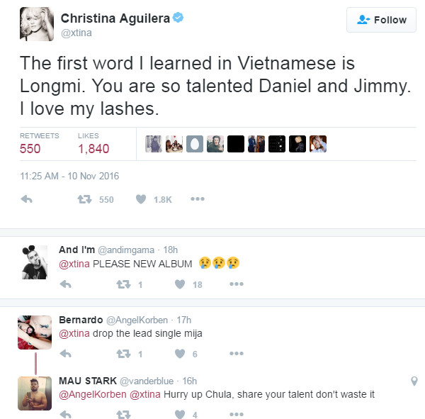 Ngắm nhìn loạt sao nổi tiếng của Hollywood gọi tên Việt Nam trong thời gian gần đây có khiến bạn nhớ đến dòng Twit cực đáng yêu của Christina Aguilera khi cô chia sẻ về Tiếng Việt vào hai năm trước: “Từ tiếng Việt đầu tiên tôi học được là Longmi (Lông mi). Daniel và Jimmy, các bạn rất tài năng. Tôi thích hàng lông mi của mình lắm”.