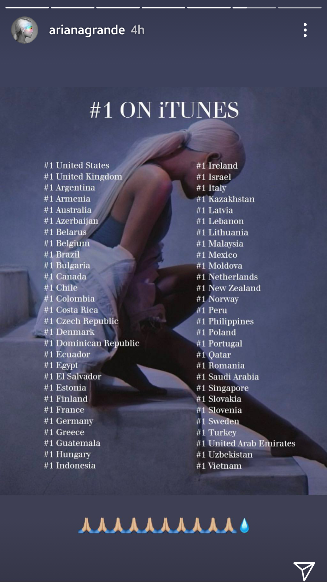 Và vào tháng 4 vừa rồi, cái tên Việt Nam tiếp tục được cô nàng này nhắc đến nhưng không phải là một lời xin lỗi nữa mà là một cách bày tỏ niềm cảm ơn cũng như sự phấn khích của Ariana khi ca khúc No Tears Left To Cry đã nhảy lên thống trị BXH iTunes của hơn 40 quốc gia và vùng lãnh thổ trên toàn thế giới.