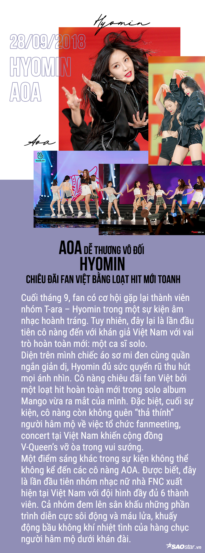 Nếu như 8 tháng đầu năm, fan lần lượt được chứng kiến các màn trình diễn của của nghệ sĩ đình đám GOT7, Samuel Kim, HyunA, Winner,… thì chỉ với 4 tháng cuối năm, số lượng sao Kpop ghé thăm và có mặt trên sân khấu Việt cũng đông đảo không kém. Cùng xem họ là ai nhé!