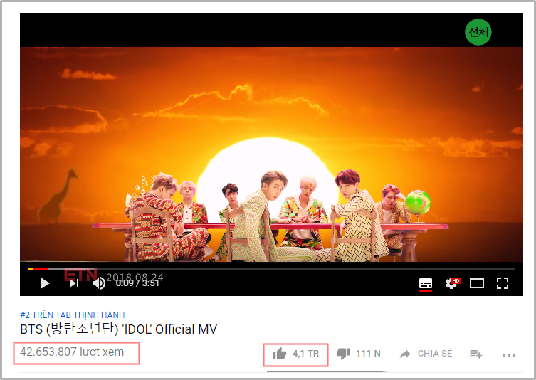 Hiện tại, chỉ sau hơn 17 giờ ra mắt, MV IDOL của BTS đã đạt hơn 42 triệu lượt xem, xác lập kỉ lục MV đạt 40 triệu view nhanh nhất chỉ sau 16 giờ 9 phút. Thành tích này trước đó được nắm giữ bởi chính BTS với MV Fake Love trong 23 giờ 24 phút. Chúc mừng BTS cùng các ARMY.