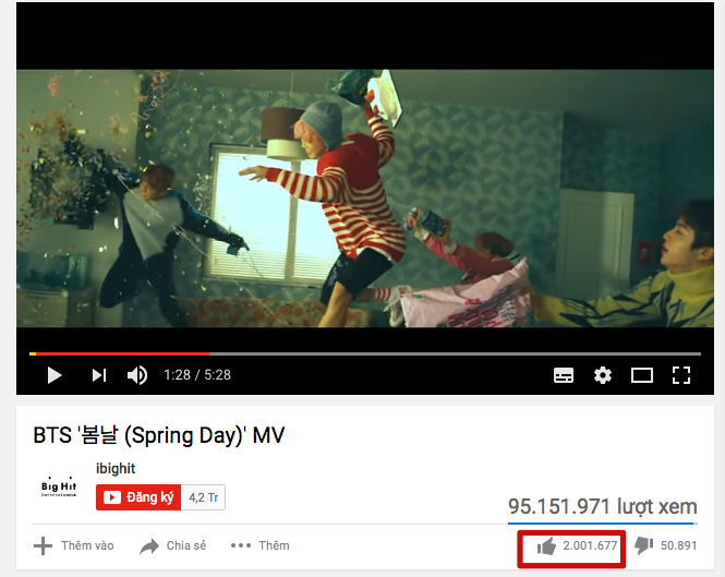 Mới đây, các fan BTS đón nhận tin vui mới từ thần tượng. Cụ thể, MV Spring Day đã đạt 2 triệu lượt like trên clip chính thức của Youtube. Khi mà lượt xem chuẩn bị cán mốc 100 triệu thì con số hơn 2 triệu like này quả thực rất ấn tượng.