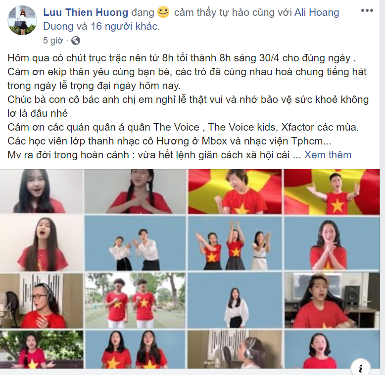 Theo chia sẻ từ nhạc sĩ Lưu Thiên Hương: “MV được quay bằng điện thoại vì muốn mang tính chất homemade ở nhà làm việc. Các bạn The Voice Kids vì ở xa nên thu và quay bằng điện thoại gửi sang bộ phận dựng. Vì tự quay nên chất lượng MV không được ổn định, mà thời gian chỉ có vài ngày cho kịp dịp lễ, cũng rất vui mừng vì hi vọng của tôi thành hiện thực 30/4 năm nay có 2 chiến thắng mà người dân Việt Nam được chào đón là ngày giải phóng đất nước và chiến thắng Covid-19. Tôi không giấu được xúc động, lòng yêu quê hương đã khiến tôi muốn được cống hiến cho đất nước như 1 người nghệ sĩ thực thụ. Thời gian này việc mời e-kip thực hiện 1 MV sẽ khó khăn cả về việc tập trung người quay đông là không thể vì vẫn phải đảm bảo an toàn và thực hiện phòng chống dịch theo quy định của chính phủ và bộ y tế. Tôi phải chia giờ cho từng cá nhân, đông nhất là 3 người tới studio . Để sẵn nước rửa tay giục mọi người liên tục trong khi thu âm và quay hình“.