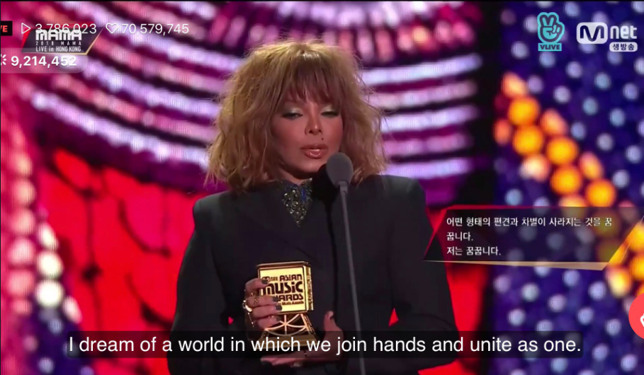 Trong đêm trao giải chính thức của MAMA 2018 tại Hong Kong vừa diễn ra cách đây ít phút, Janet Jackson đã được trao giải thưởng Inspiration Awards - dành cho những ngôi sao biểu tượng truyền cảm hứng đến âm nhạc toàn thế giới. Đây có thể xem là một giải thưởng dành cho tượng đài, là sự vinh danh cao nhất của giải thưởng cho một huyền thoại âm nhạc của thế giới.