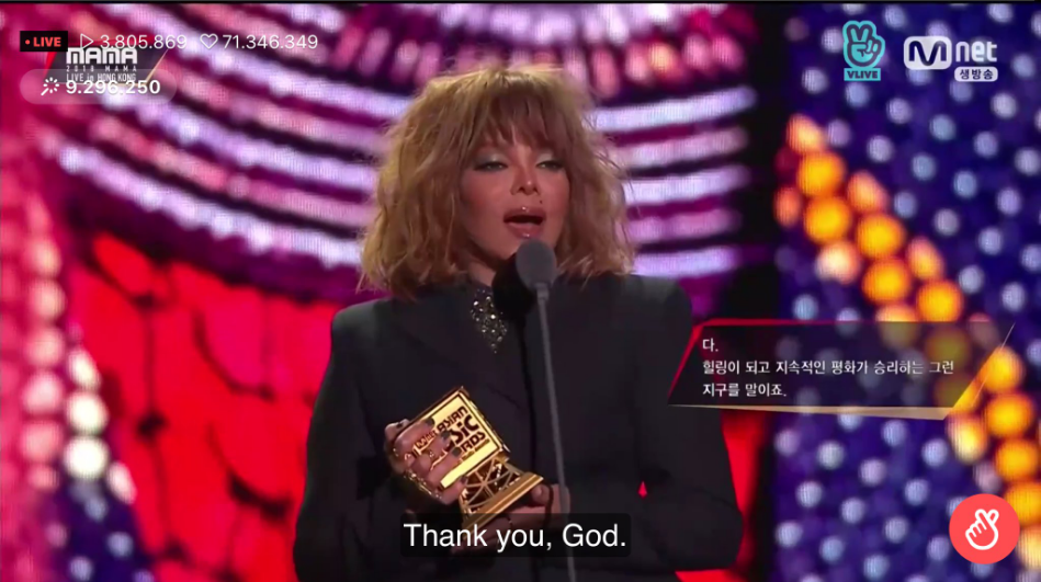 Sau khi được BTS giới thiệu lên sân khấu, đích thân Song Joong Ki đã trao chiếc cúp cho Janet Jackson. Tại đây, nữ ca sĩ đã có một bài phát biểu ngắn nhưng đầy cảm xúc về đam mê âm nhạc và nữ quyền.