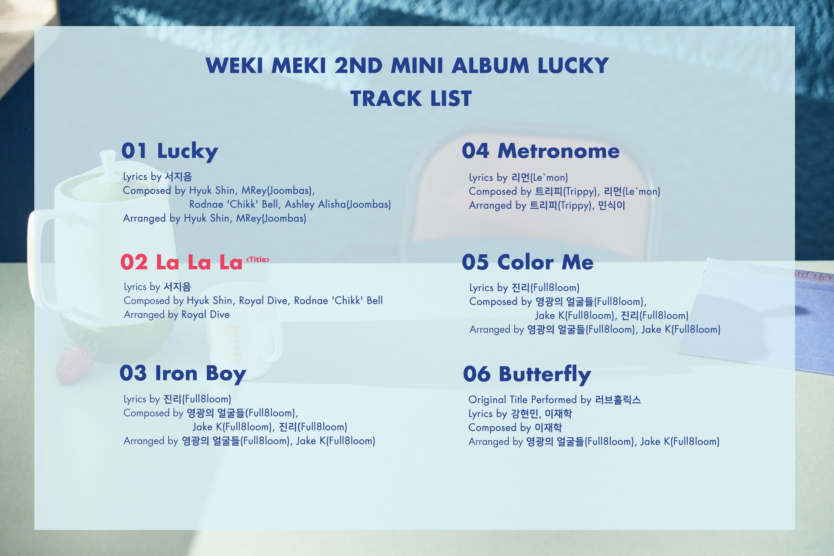 Trở lại cùng thời điểm với MAMAMOO là 8 cô gái Weki Meki. Sau khoảng thời gian khủng hoảng từ công ty chủ quản, girlgroup này cũng đã sẵn sàng lên sàn. Cụ thể, mini album lần này tựa đề Lucky với ca khúc chủ đề La La La. Được biết, góp sức vào việc sản xuất mini album là những nhà sản xuất đã tạo nên thành công của loạt “bom tấn”: Monster, Lotto (EXO), Why (Taeyeon), Mr Mr (SNSD),…