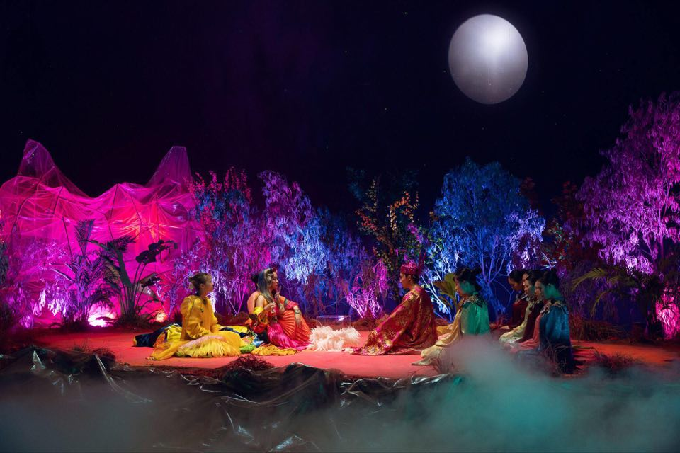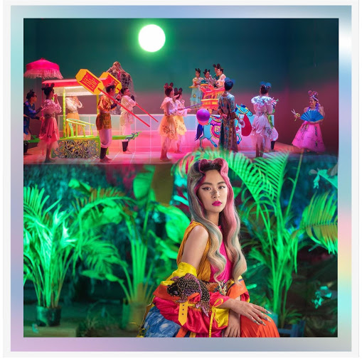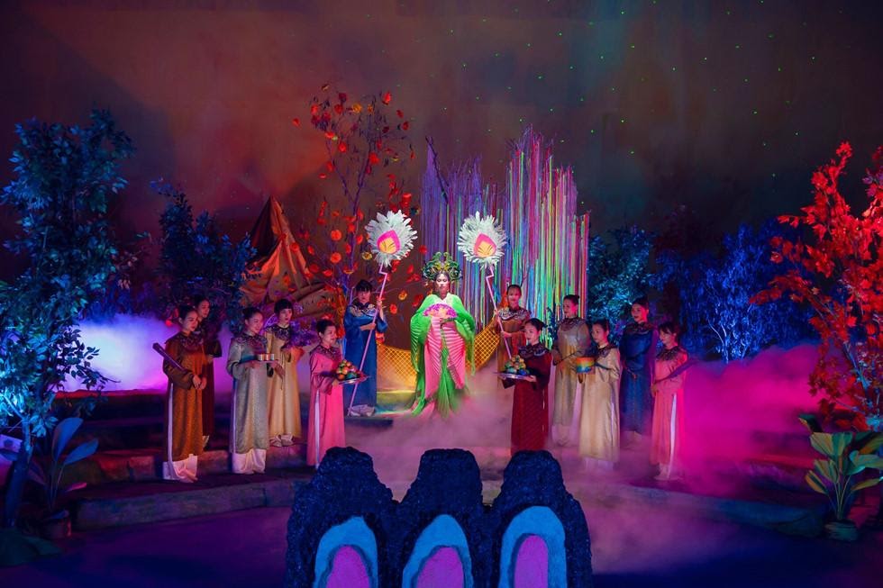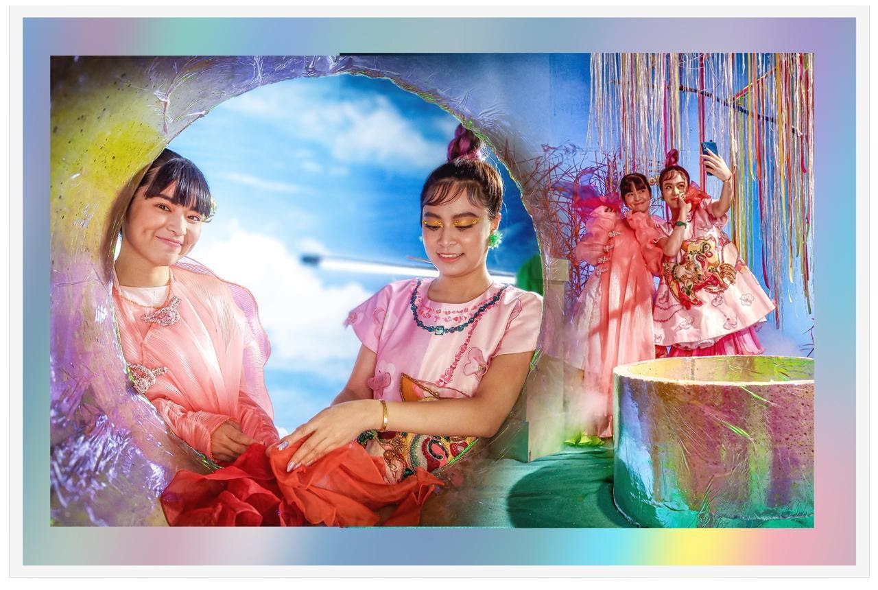 Đề cao văn hóa dân gian Việt, concept “Tranh Hàng Trống” được phối lại màu bằng những mảng color-block thời thượng, kết hợp cùng trang phục tie-dye màu loang xanh - hồng tím điện quang.