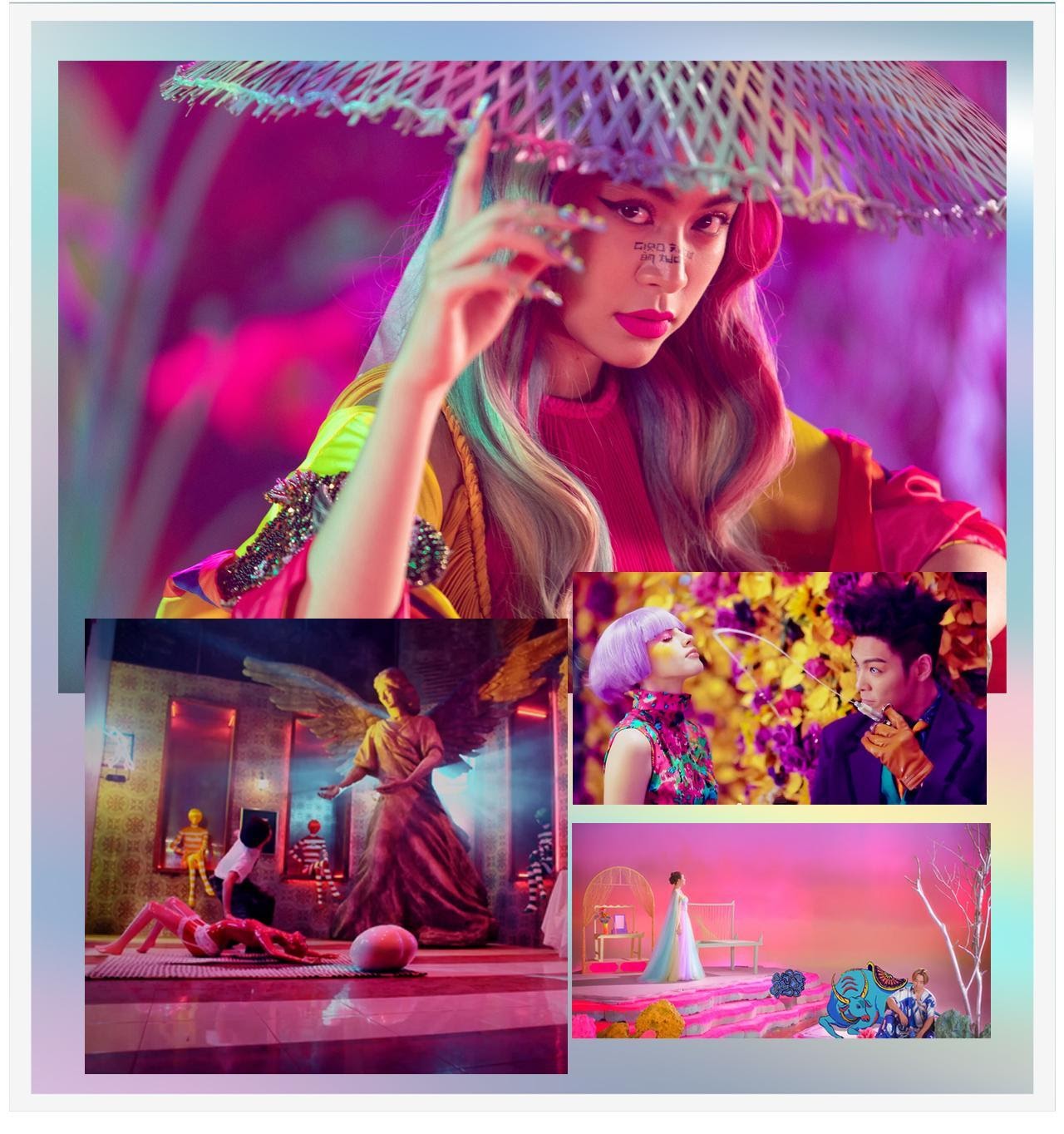 Màu sắc trong MV của Hoàng Thùy Linh sẽ khiến nhiều người nhớ tới các phân cảnh “lạc trôi” trong MV “Bae Bae” của BIG BANG, do đó màu tím ruby cũng được tận dụng triệt để. Những đường line tạo điểm nhấn trên mái tóc hay chiếc áo knit mang tông hồng nóng tạo thành phép chơi màu táo bạo, đẹp mắt.