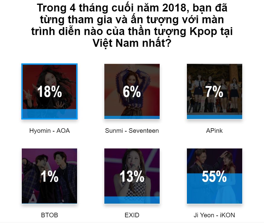 Nhân dịp cuối năm cũ 2018 - đầu 2019, Saostar đã mở cuộc bình chọn cho màn trình diễn của sao Kpop được khán giả yêu thích nhất trên sân khấu Việt. Với tổng cộng 12 sân khấu có nghệ sĩ Kpop tham dự, danh sách được chia ra thành 8 tháng đầu năm và 4 tháng còn lại với những cái tên ấn tượng nhất: GOT7, Hyomin, EXID, Seventeen, HyunA, GFriend, Apink,…
