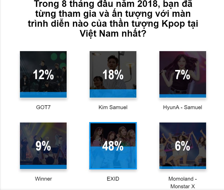 Và mới đây, theo kết quả được cập nhật, danh sách những cái tên dẫn đầu đã lộ diện. Dẫn đầu bình chọn 8 tháng đầu năm không ai khác chính là các cô nàng EXID. Nhóm thu về chiến thắng áp đảo với 48% tổng lượng vote, gần gấp 3 lần so với á quân là anh chàng Samuel Kim với 18% số lượt bình chọn từ khán giả.