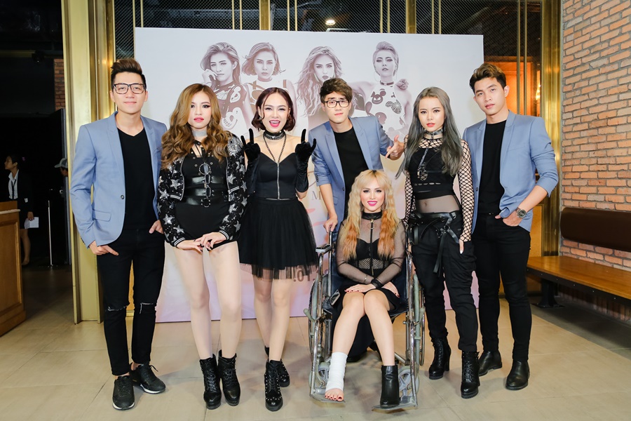 S Girls tại buổi họp báo. Chung Thương do gặp chấn thương nên buộc phải xuất hiện với xe lăn.
