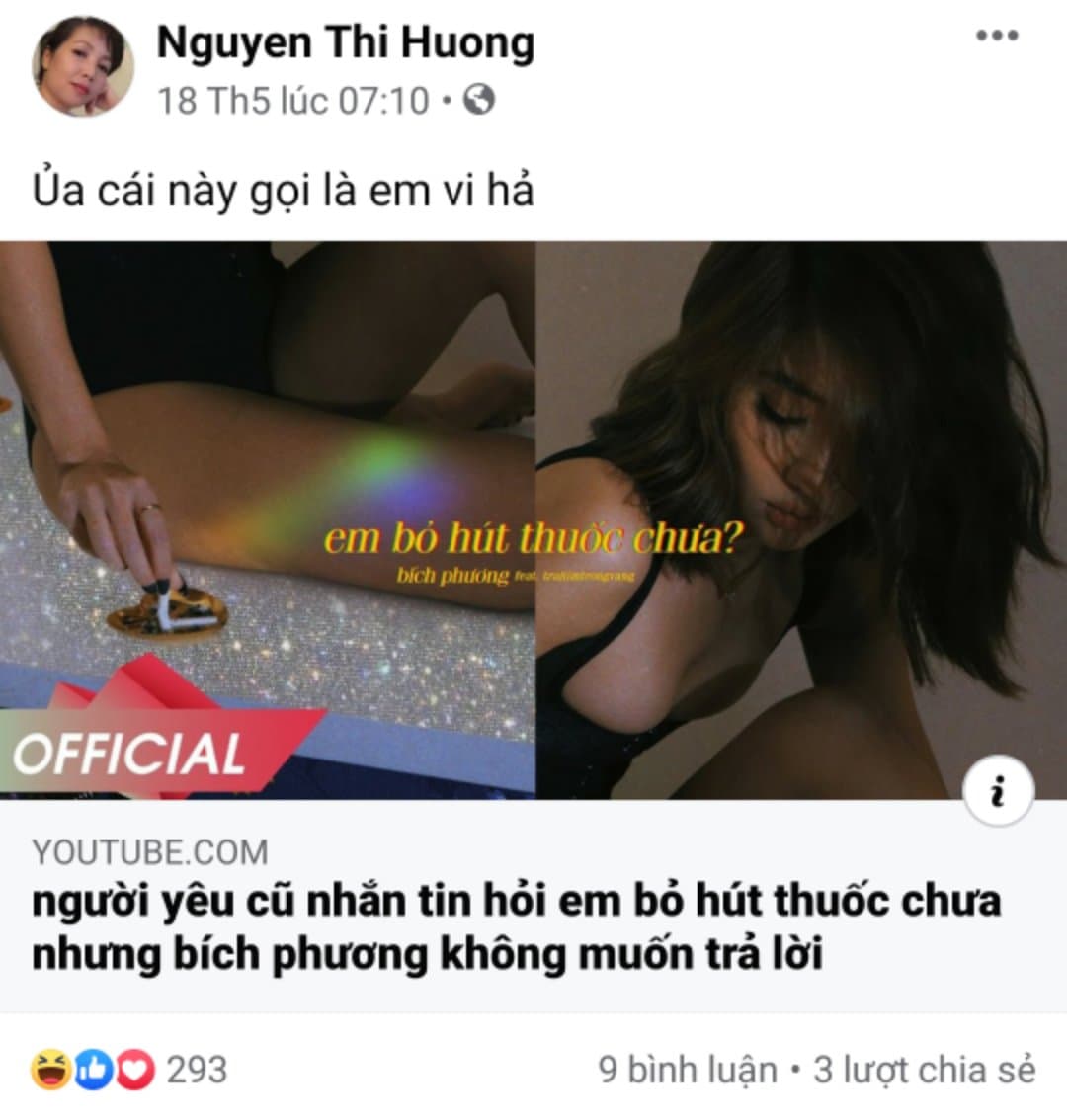 Lội ngược dòng thời gian của mẹ Bích Phương, không hiếm những bài viết cô chia sẻ MV của con gái với loạt caption đọc thôi đã “cười ra nước mắt”. Trước đó là Một cú lừa với lời nhắn nhủ: “Nó lừa lại kiếm thằng khác con à. Không có thằng vắng thì có thằng đông thằng vui thiếu gì…”. Thậm chí mẹ Bích Phương còn thắc mắc Em bỏ hút thuốc chưa có phải là MV hay không?