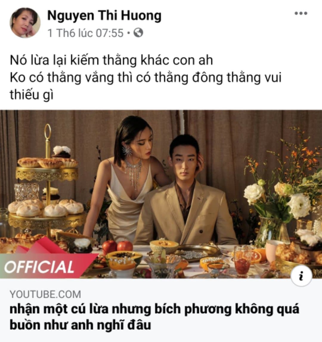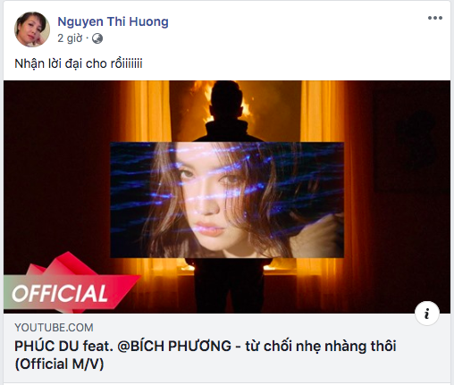 Cụ thể, trên trang Facebook cá nhân, mẹ của Bích Phương đã chia sẻ MV Từ chối nhẹ nhàng thôi với dòng caption: “Nhận lời đại cho rồi“. Lời chia sẻ vô cùng ngắn gọn nhưng lại khiến khán giả và người hâm mộ Bích Phương vô cùng thích thú vì quá mặn mà. Không ít ý kiến còn cho rằng, sự mặn mà Bích Phương có được là do ảnh hưởng khá nhiều từ mẹ cô nàng.