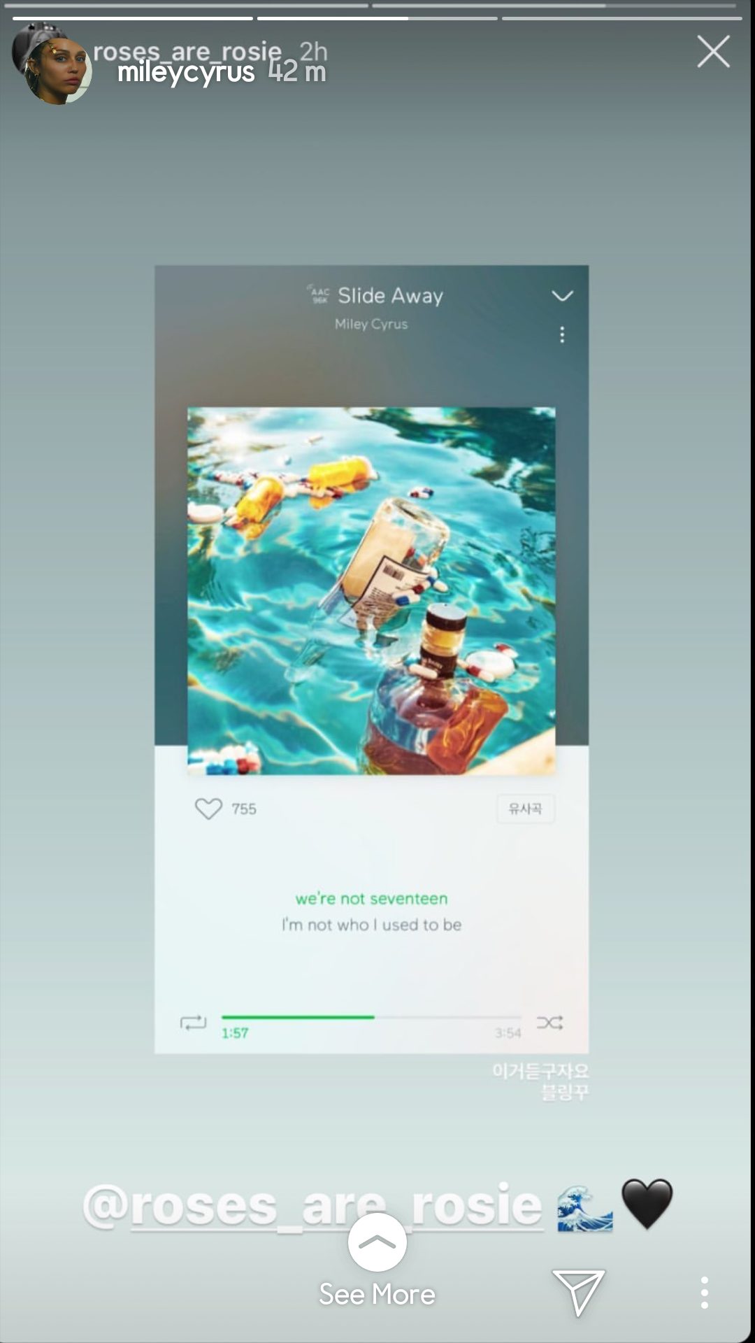 Tối ngày 16/9, cộng đồng fan Miley Cyrus và Rosé (BlackPink) trở nên phấn khích hơn bao giờ hết khi 2 nữ nghệ sĩ đã có những tương tác bất ngờ trên cả Twitter và Instagram. Mọi chuyện bắt đầu khi main vocal BlackPink đăng tải story Instagram đang nghe ca khúc Slide Away - sản phẩm vừa được Miley phát hành 1 tháng trước.
