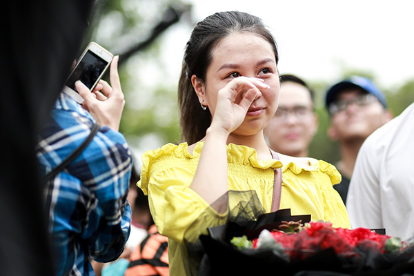 Ngay khi Hiển xuất hiện với bó hoa trên tay, cũng là lúc bạn gái cậu không kìm được nước mắt.