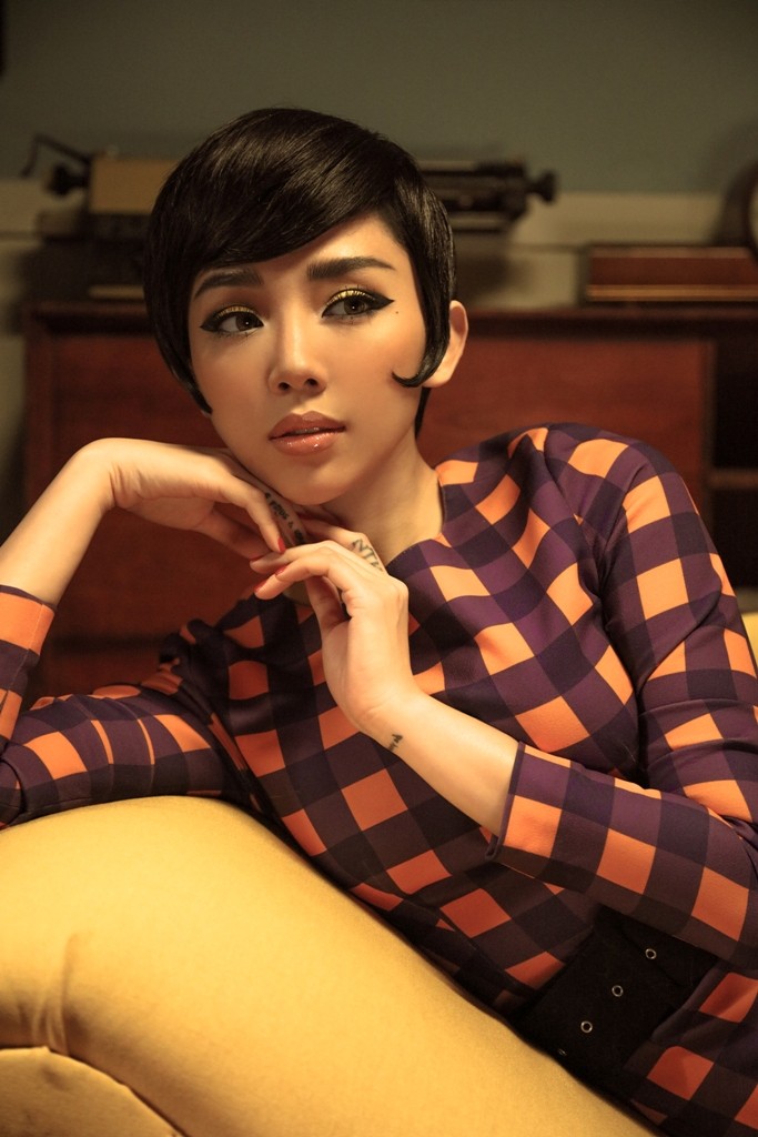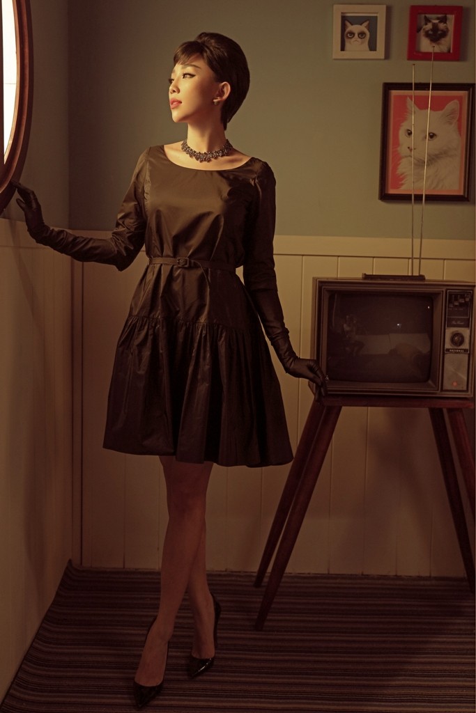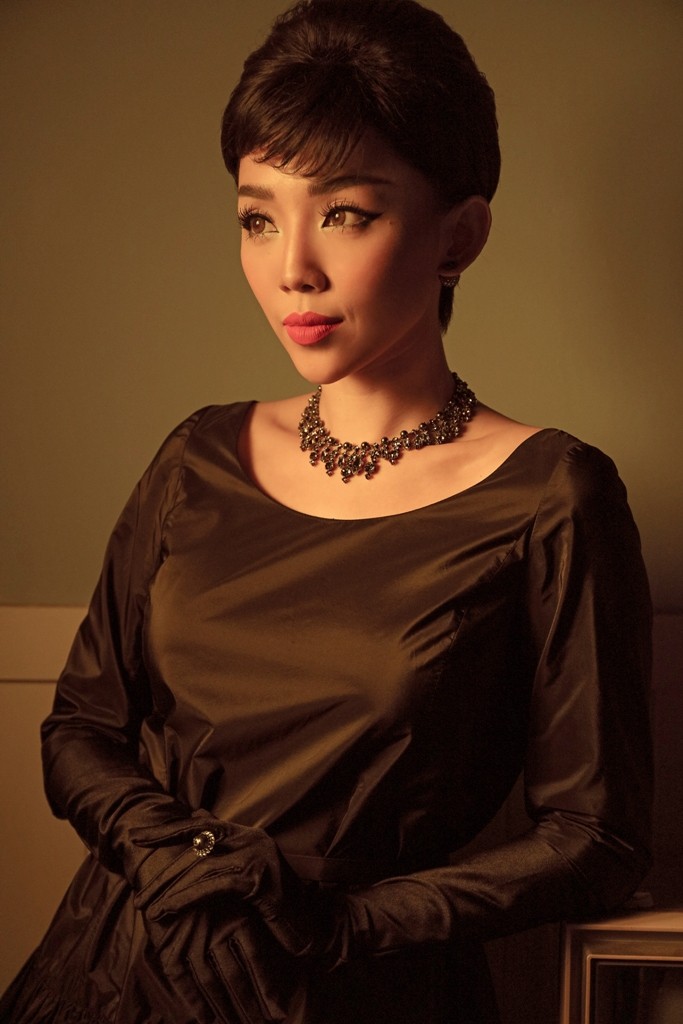 Với nguồn cảm hứng thời trang từ thập niên 60, Tóc Tiên thể hiện hình ảnh đầy cổ điển, từ phong cách trang điểm mắt mèo cầu kỳ đến bộ trang phục gợi nhớ “little dress” huyền thoại của làng mốt thế giới.