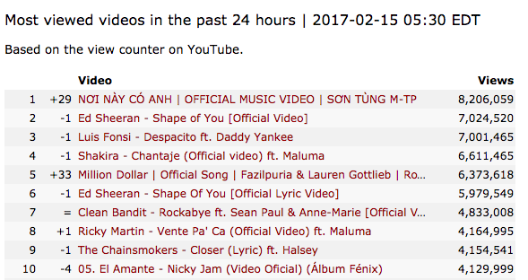 Câu chuyện về buổi sáng đẹp trời 15/2/2017: MV Sơn Tùng là sản phẩm âm nhạc được xem nhiều nhất thế giới (tính theo ngày).