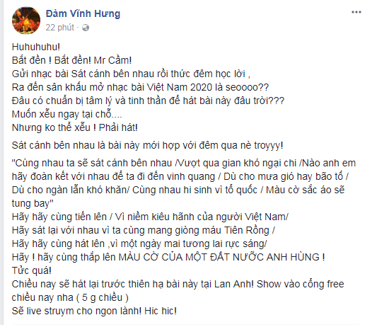 Tối 28/1, gala chào đón các tuyển thủ U23 Việt Nam đã diễn ra trong sự hào hứng, mong đợi của hàng chục ngàn khán giả tại SVĐ Mỹ Đình, Hà Nội dù thời tiết không được thuận lợi. Bên cạnh lễ vinh danh các cầu thủ, buổi gala còn có sự tham gia biểu diễn của nhiều ca sĩ nổi tiếng. Phải kể đến là màn trình diễn sôi động của Mr. Đàm dành cho U23 Việt Nam. Tuy nhiên, ngay khi khép lại đêm gala, nam ca sĩ đã đăng tải trên trang cá nhân dòng tâm trạng “nửa đùa, nửa thật”: “Gửi nhạc bài Sát cánh bên nhau rồi thức đêm học lời, ra đến sân khấu mở nhạc bài Việt Nam 2020 là sao?”