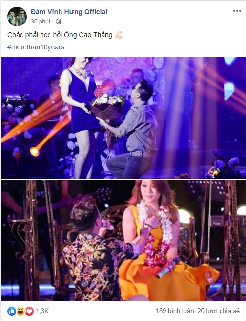 Cách đây ít phút, cộng đồng mạng như được một phen vô cùng phấn khích với dòng trạng thái của nam ca sĩ Đàm Vĩnh Hưng. Theo đó, “ông hoàng nhạc Việt” đăng tải tấm hình “cầu hôn” Mỹ Tâm kèm dòng chữ: “Chắc phải học hỏi Ông Cao Thắng”.