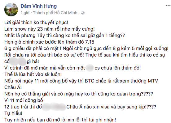 Sau khi Đàm Vĩnh Hưng trượt giải Best Southeast Asia Act, anh vô cùng phẫn nộ cho rằng MTV Việt Nam vô trách nhiệm. Đáp lại, phía MTV cũng tỏ ra cầu thị và lên tiếng xin lỗi cũng như đính chính mọi hiểu lầm không đáng có. Tuy nhiên, “ông hoàng nhạc Việt” một lần nữa đáp trả, khẳng định loạt lý lẽ phía đối tác đưa ra không thuyết phục.