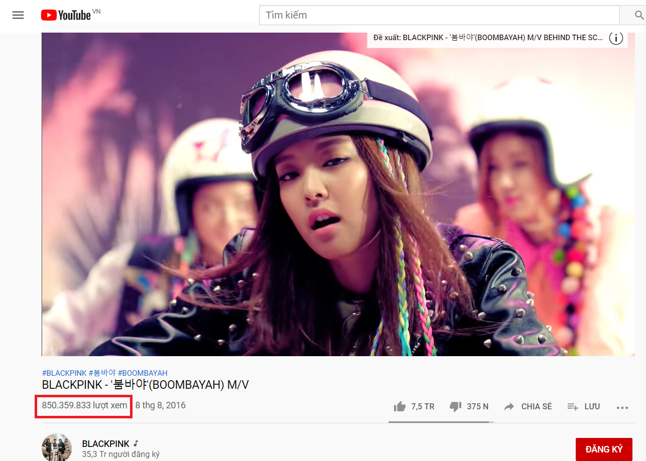 MV BOOMBAYAH của BlackPink chính thức đạt 850 triệu view.