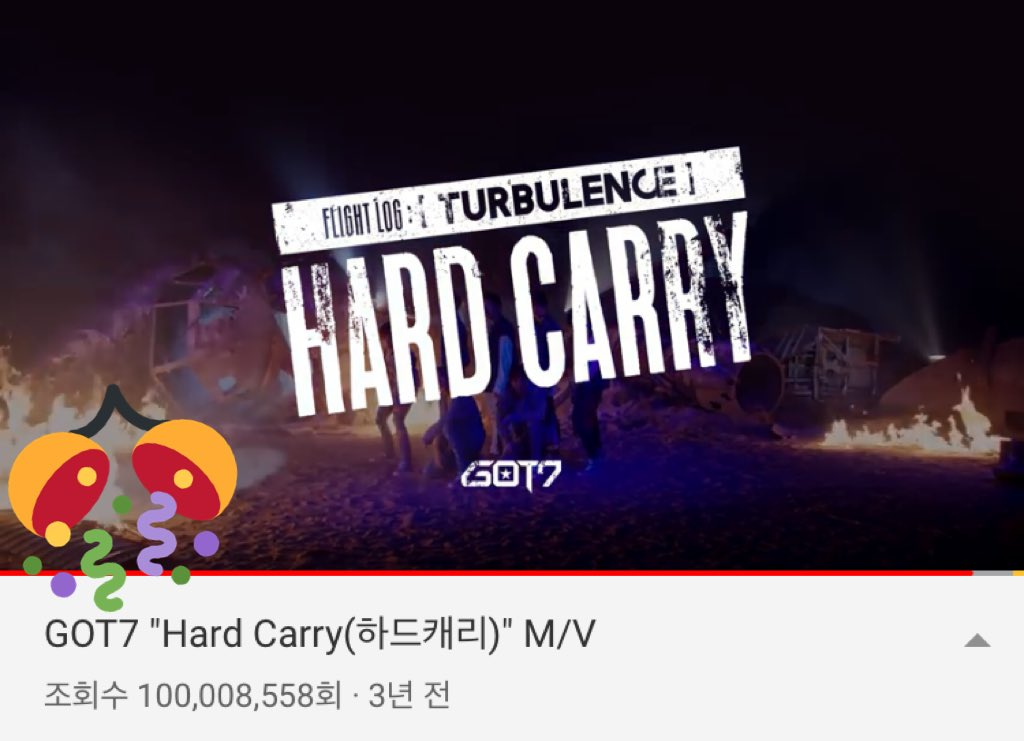 Theo đó, vào ngày 31/5, MV Hard Carry của GOT7 chính thức đạt 100 triệu view trên trang Youtube của JYP Entertainment. Bản hit này đã được nhóm chính thức xuất xưởng vào 26 tháng 9 năm 2016, có nghĩa là GOT7 đã mất chưa đến 4 năm để có thể làm nên thành tích này. Ca khúc Hard Carry nằm trong album Flight Log: Turbulence đánh dấu màn comeback đầy ấn tượng của nhóm trong năm 2016. Hard Carry mang đến những chàng trai GOT7 mạnh mẽ, bùng nổ năng lượng cùng những tạo hình cá tính. Hard Carry đã giúp GOT7 vươn xa tên tuổi của mình trong thị trường âm nhạc xứ Kim Chi năm ấy.