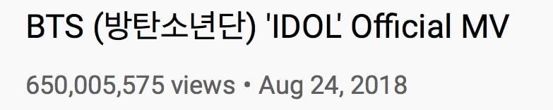 Theo đó, vào đúng ngày 25 tháng 4, MV IDOL của BTS cán mốc 650 triệu view trên Youtube. Bản hit này đã được nhóm chính thức xuất xưởng vào ngày ngày 24 tháng 8 năm 2018, có nghĩa là nhóm chỉ mất khoảng 1,5 năm để có thể làm nên thành tích này. Có thể nói, IDOL là một trong những sản phẩm để đời của BTS khi giúp nhóm được biết đến nhiều hơn, vươn xa tên tuổi không chỉ ở thị trường Hàn Quốc mà còn ra đến tận quốc tế.