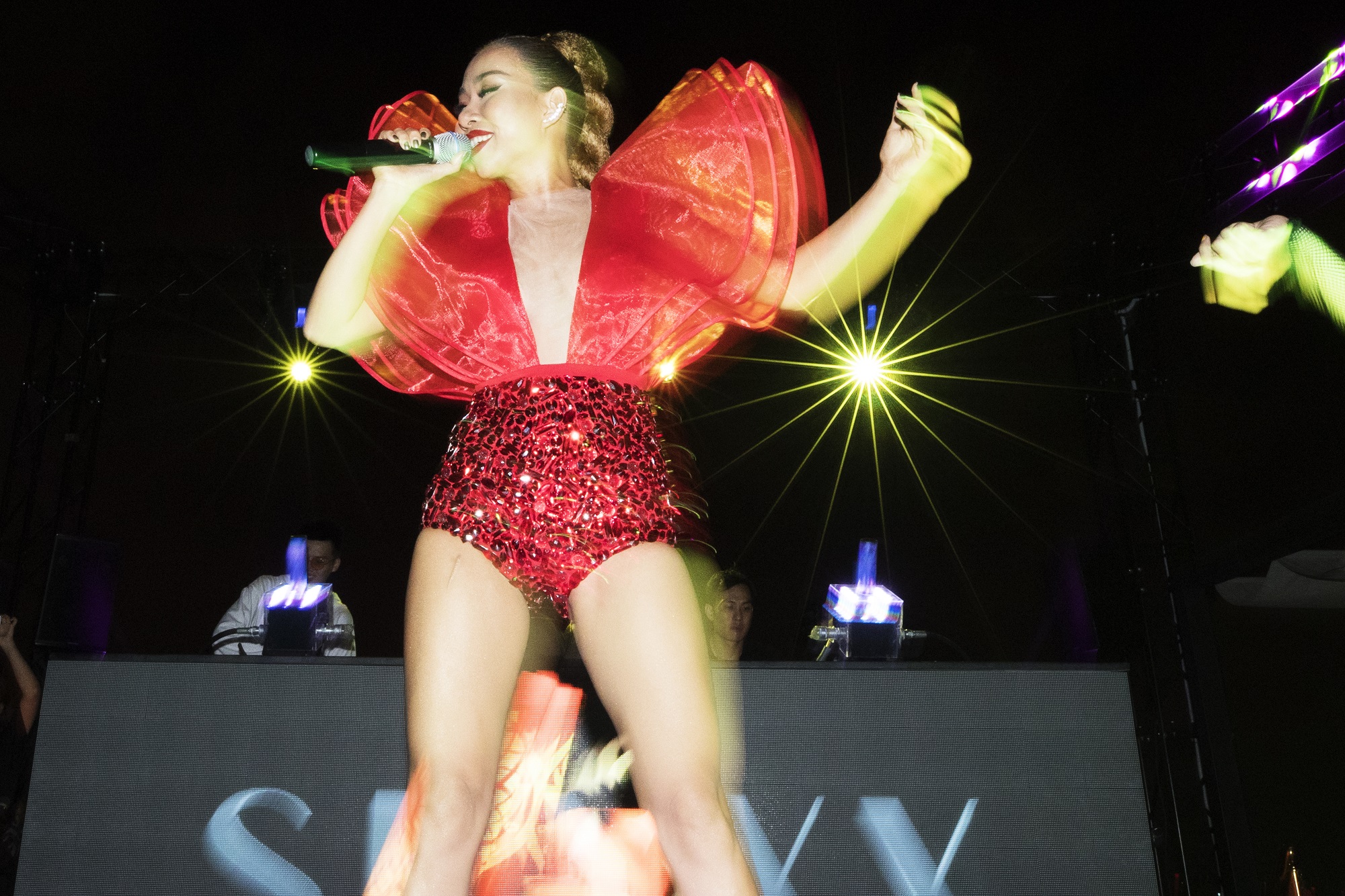 Xuất hiện trong đêm nhạc, nữ ca sĩ diện trang phục tông màu đỏ nổi bật cực sexy.