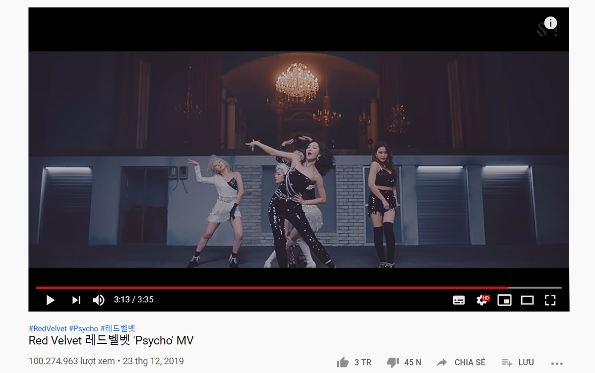 MV Psycho của Red Velvet chính thức được ra mắt vào ngày 23/12 năm 2019 và ngay kể từ khi phát hành, bài hát này đã nhận được đánh giá rất cao từ cả khán giả và giới phê bình. Và mới đây, tính đến ngày 26 tháng 3, sau hơn ba tháng, hai ngày và 7 giờ ra mắt, MV này đã vượt qua được 100 triệu lượt xem trên kênh youtube chính thức của SM Ent - trở thành MV của Red Velvet đạt cột mốc này nhanh nhất từ trước đến giờ.