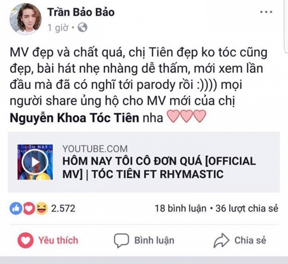 Không chỉ khiến khán giả thích thú, MV còn nhận được sự ủng hộ nhiệt tình từ những ngôi sao trong làng giải trí Việt như: Soobin Hoàng Sơn, Thái Trinh, Trịnh Thăng Bình, Rhymastic, Kai Đinh, Đức Phúc, Châu Đăng Khoa,… Các nghệ sĩ đều bày tỏ sự đồng cảm với lời ca khúc và ấn tượng với MV độc và chất của Tóc Tiên. Tóc Tiên đã nhận được “cơn mưa” lời khen của chính các đồng nghiệp.