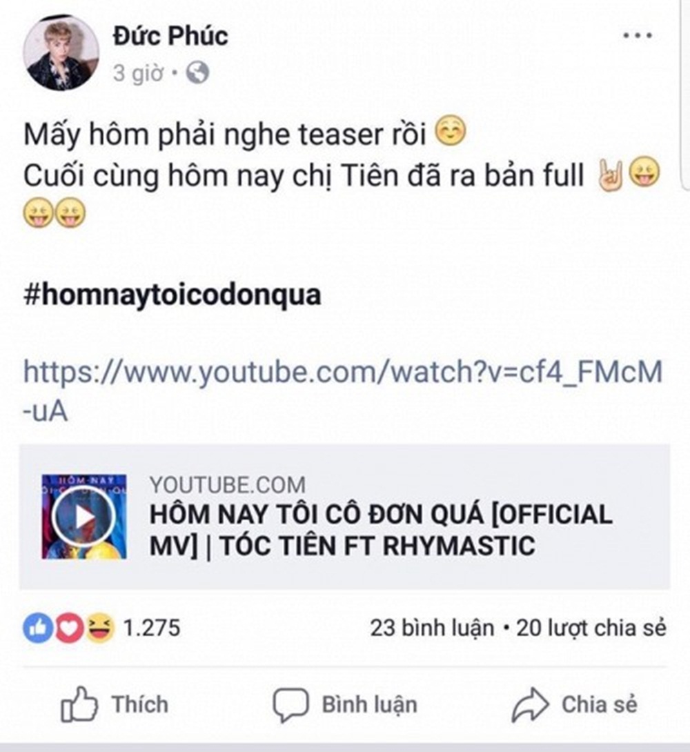 Anh chàng Đức Phúc thì bày tỏ đã nghe đi nghe lại Hôm nay tôi cô đơn quá thời điểm mà ca khúc mới chỉ tung teaser.