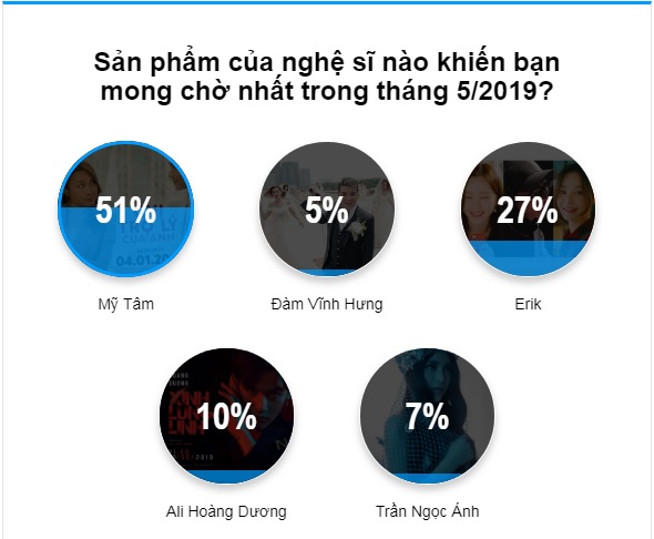 Chiếm tỉ lệ áp đảo với 51%, Mỹ Tâm đã xuất sắc chiến thắng với sản phẩm đang được chờ đợi nhất tháng 5.
