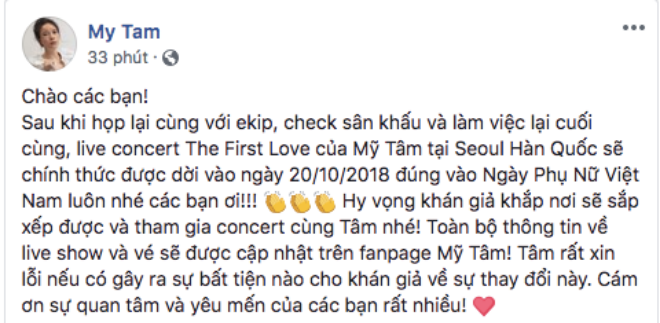 Mỹ Tâm đăng status thông báo về việc dời ngày diễn ra solo concert tại Hàn Quốc.