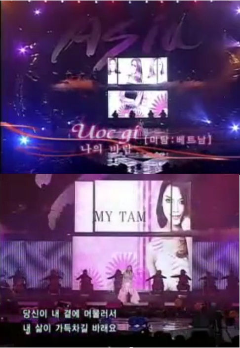 Để bắt đầu về mối “duyên nợ” giữa mảnh đất hình chữ S với festival âm nhạc này, chắc chắn phải nhắc đến Mỹ Tâm đầu tiên! Và cũng không có gì bất ngờ khi sân khấu của Mỹ Tâm đạt đến 44% tổng số lượt bình chọn! Có thể thấy, ngay từ kì tổ chức đầu tiên, tên tuổi của Việt Nam đã được mời đến, chứng tỏ sức hút và tầm ảnh hưởng của Họa mi tóc nâu lúc ấy đã không thể xem thường được! Mỹ Tâm lúc ấy đã biểu diễn một trong những “siêu hit” làm nên tên tuổi của mình: Ước gì và đã nhận được sự ủng hộ nồng nhiệt của người hâm mộ xứ kim chi.