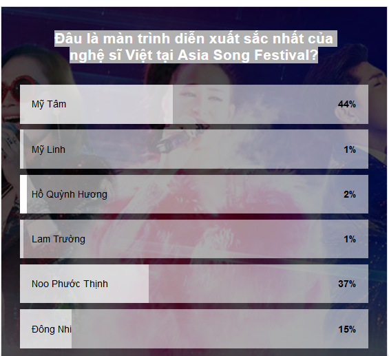 Trong bài viết Trước Vũ Cát Tường, tự hào loạt sao Việt 'đem chuông đi đánh xứ người', 'rực rỡ' tại Asia Song Festival!, SAOStar đã đặt câu hỏi cho các độc giả như sau: Đâu là màn trình diễn xuất sắc nhất của nghệ sĩ Việt tại Asia Song Festival? Và có lẽ câu trả lời sẽ khiến bạn…. chẳng bất ngờ gì cho cam!