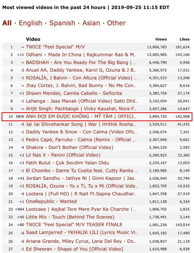 Và mới nhất, người hâm mộ của nữ ca sĩ Mỹ Tâm lại tiếp tục đón nhận thành tích mới nhất từ thần tượng. Theo đó, sau chưa đầy 2 ngày phát hành, MV Anh đợi em được không đã chính thức đạt vị trí “ngôi vương” top 1 trending cùng hơn 4 triệu lượt xem trên Youtube. Bên cạnh đó, sản phẩm trở lại của Mỹ Tâm cũng xuất sắc lọt top 10 MV được xem nhiều nhất thế giới tính trong ngày 25/9. Đây quả thực là niềm tự hào không hề nhỏ với các fan của Mỹ Tâm cũng như chính nữ ca sĩ.