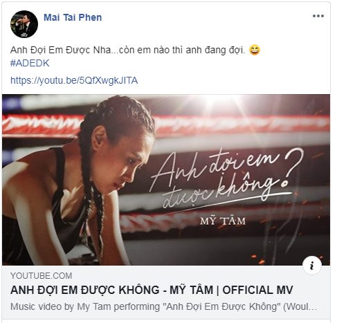 Đặc biệt, mới đây các fan không khỏi thích thú trước dòng trạng thái trên trang cá nhân của nam diễn viên Mai Tài Phến. Nếu như Mỹ Tâm hỏi Anh đợi em được không, anh chàng đã nhanh chóng đáp lại: “Anh đợi em được nha”. Dưới phần bình luận, các fan đã vô cùng phấn khích và thêm một lần được dịp “đẩy thuyền” cho cặp đôi Mỹ Tâm - Mai Tài Phến.