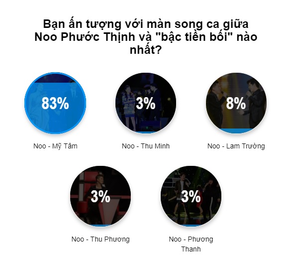 Và ngay sau khi bài viết Noo Phước Thịnh cất giọng ca cùng tiền bối: Sân khấu 2 thế hệ nào làm bạn xốn xang? lên sóng, rất đông độc giả của SAOstar đã quan tâm và tham gia vào cuộc bình chọn xem đâu là màn kết hợp với ca sĩ đàn anh đàn chị của Noo gây ấn tượng nhất. Và kết quả thật bất ngờ khi có tới 83% kết quả bình chọn của khán giả đều đồng lòng gọi tên Mỹ Tâm - Noo Phước Thịnh.
