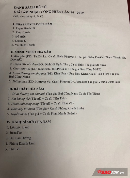 Danh sách đề cử Giải thưởng âm nhạc Cống hiến 2019 chính thức được công bố.