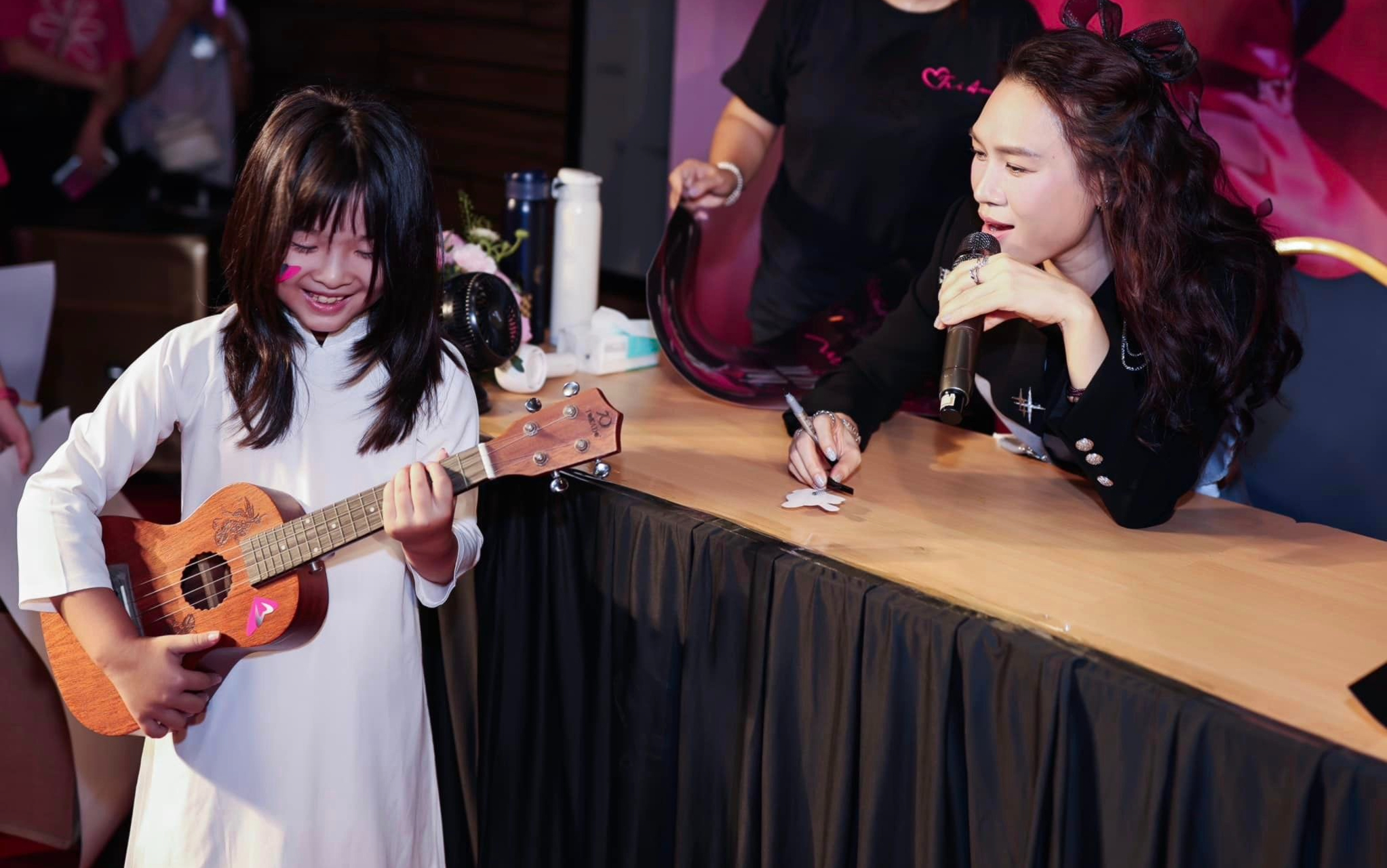 Ngoài ra, trong buổi công chiếu liveshow Tri Âm, Mỹ Tâm còn chứng kiến thêm một khoảnh khắc đặc biệt nữa đến từ một fan nhí. Cụ thể, nữ ca sĩ đã ngồi dưới hàng ghế cùng khán giả, đứng bên cạnh Mỹ Tâm là một bé gái.