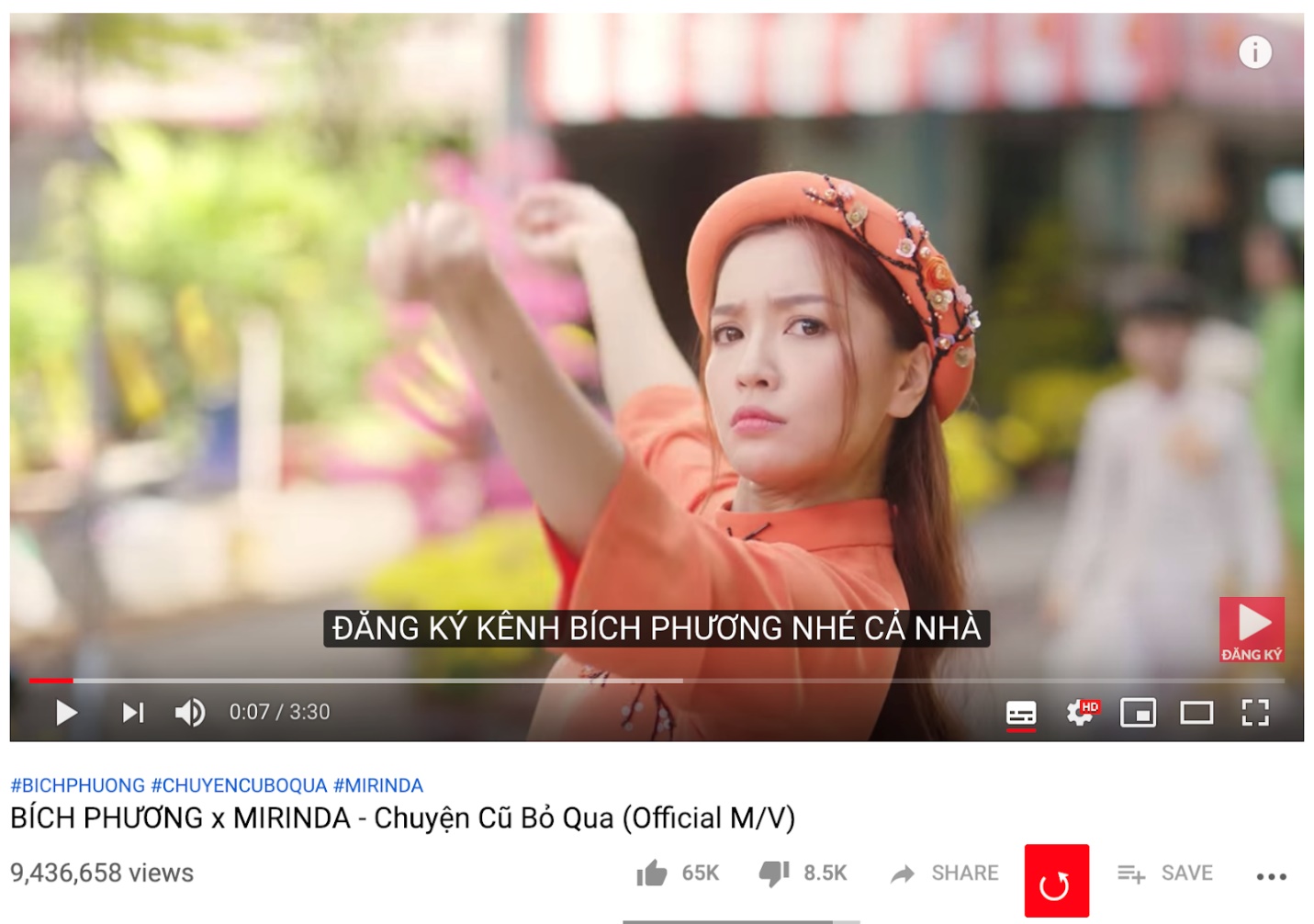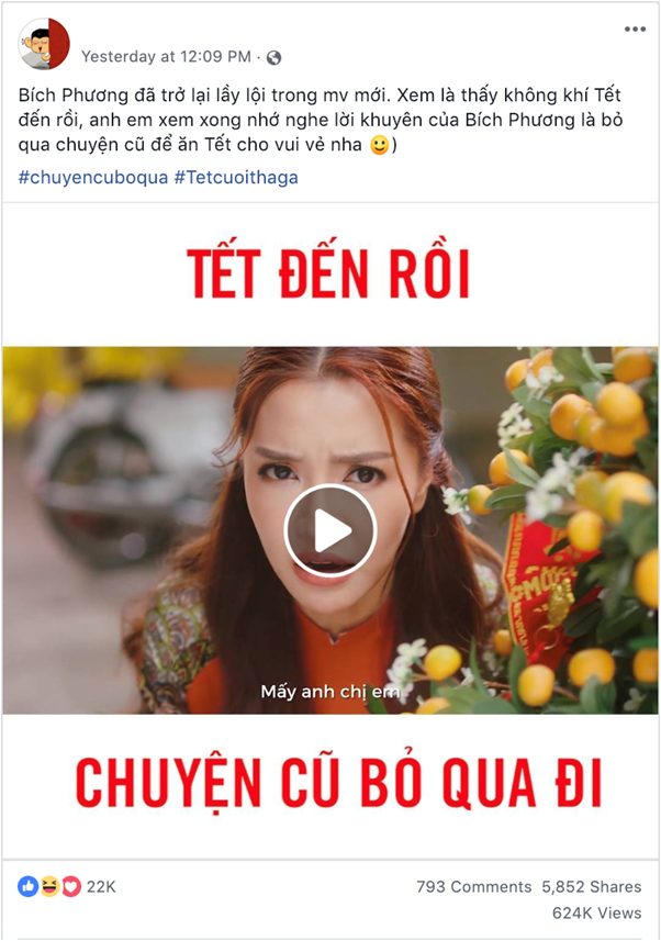 Đón Tết trước nhất, Bích Phương cũng là người nhận được tin vui sớm nhất. Chỉ sau 24 giờ ra mắt, MV “Chuyện cũ bỏ qua” đã được hơn 9 triệu lượt xem và tất nhiên trong đó có không ít sự ủng hộ từ các fan, nghe xong là muốn Tết về liền.