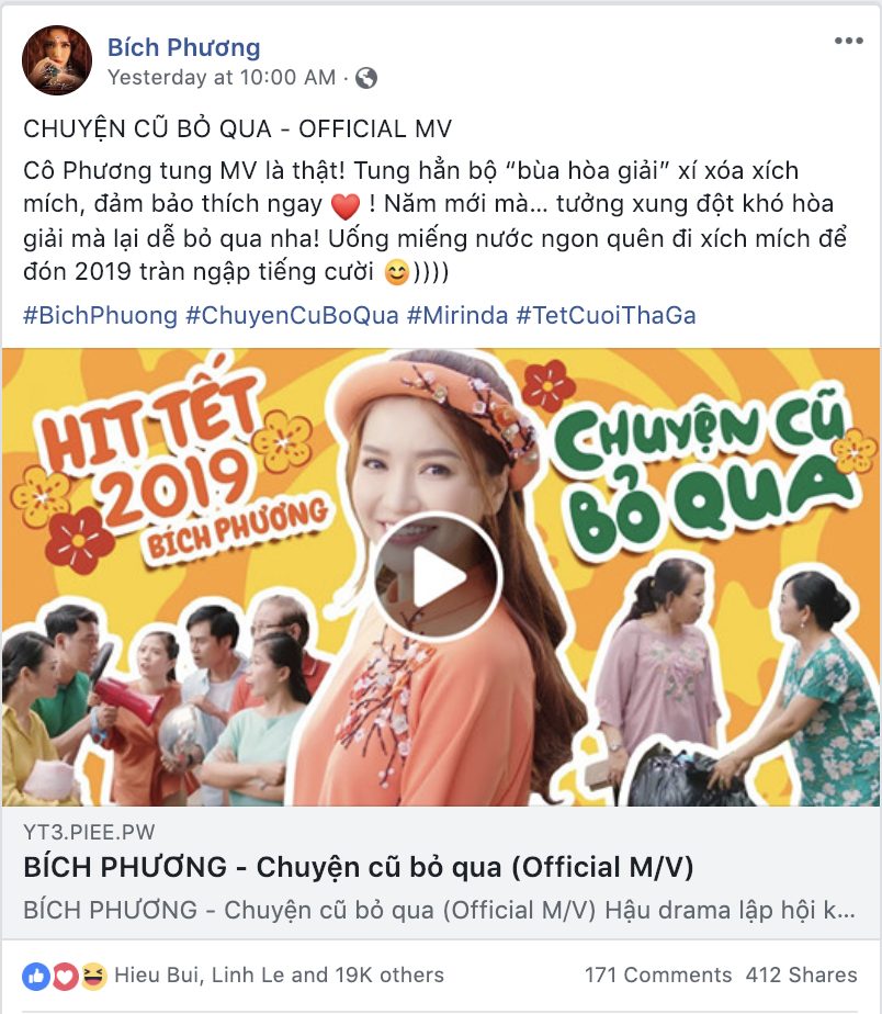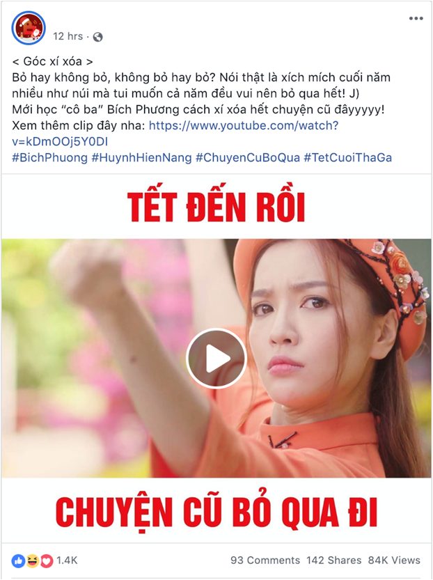 Dù chỉ mới ra mắt vài ngày nhưng “Chuyện cũ bỏ qua” cũng đã hội đủ các yếu tố, dự báo trở thành một hot trend càn quét mùa Tết này chẳng kém gì “Bao giờ lấy chồng” nhờ thông điệp dễ thương cùng hình ảnh “cô ba hòa giải” Bích Phương. Nghe ngóng khắp nhà trên xóm dưới, cứ thấy có biến là cô nàng lại tung ngay “bùa hòa giải”, giúp mọi người xí xóa những chuyện không vui, bỏ qua hết để cùng đón Tết sớm rộn ràng hơn.