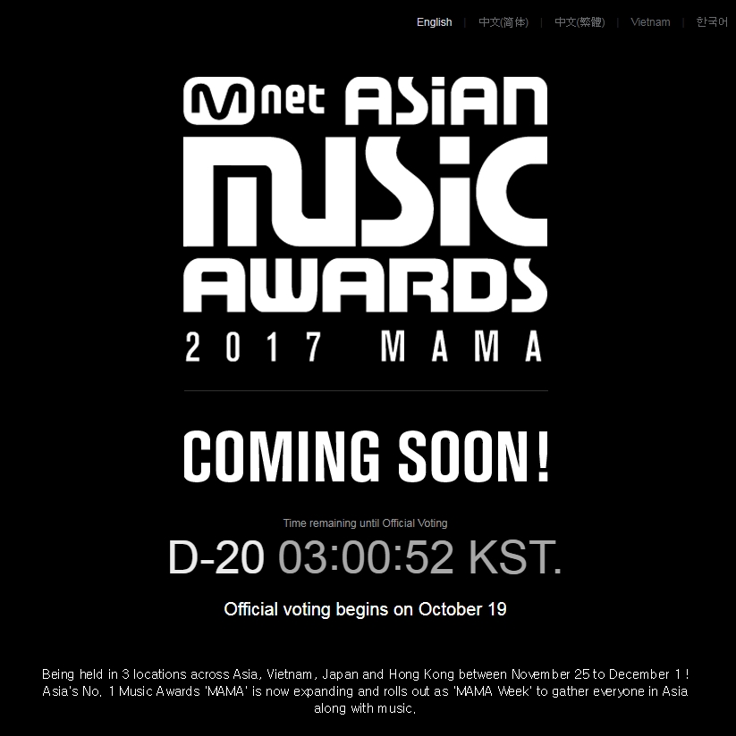 Và mới đây, trang web bình chọn online của MAMA 2017 đã chính thức ấn định thời điểm mở cửa: 19/10. Đồng thời, bộ đếm countdown cũng hiển thị trên màn hình để các fan có thể dễ dàng theo dõi.