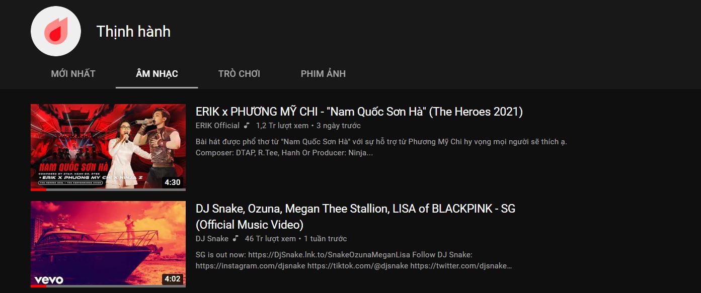 Cụ thể, theo hiển thị của hệ thống ngày 29/10, Nam Quốc Sơn Hà của Erik và Phương Mỹ Chi đã đạt #1 trending âm nhạc trên Youtube Việt. Màn trình diễn của Erik cho vòng bán kết của The Heroes được đăng tải vào ngày 25/10/2021, có nghĩa nam ca sĩ chỉ mất khoảng 4 ngày cho thành tích ấn tượng này.