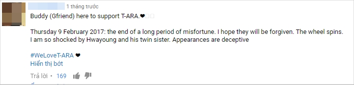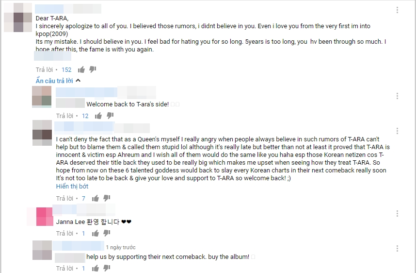 Một cư dân mạng đã gửi lời xin lỗi tới các cô gái: “… Tôi đã tin vào những tin đồn đó và mất niềm tin vào các bạn. Dù cho tôi đã từng hâm mộ nhóm từ năm 2009. Đó là một sai lầm. 5 năm là quá dài và không thể tưởng tượng được những gì các bạn đã phải trải qua. Hy vọng sau này nhóm sẽ lấy lại vị trí đỉnh cao thêm một lần nữa”. Rất nhiều ý kiến ủng hộ bình luận này cũng như chia sẻ rằng: “Chưa bao giờ là muộn cho sự trở lại và hãy chào đón T-ara trở lại một lần nữa”.